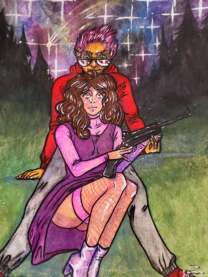 Created with acrylic paint, glitter, and rhinestones, sealed in epoxy resin on 11"x14" stretched canvas, mounted on a beaded wire. A very sparkly acrylic painting depicts a skull with a missing front tooth and a pink bow in a swarm of venus flytraps. Within the plants, small tokens of childhood glitter: a Barbie head, familiar candy, half of a BFF necklace, a Hello Kitty keychain, pink nail polish, and plastic gems. Flesh flies mingle with the items -- one fly in particular is cleaning the inside of the skull's eye socket.